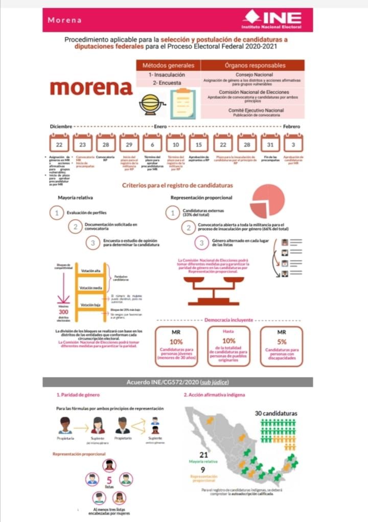 El partido Movimiento Regeneración Nacional, emitió esta mañana los procedimientos para la elección de aspirantes a diputados federales que inicia mañana 22 de diciembre y concluye el 3 de febrero de 2021 con la elección de los candidatos.