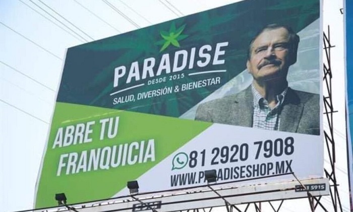 La imagen del expresidente Vicente Fox aparece en los anuncios espectaculares de la empresa Paradise, que promociona productos de marihuana y convoca a comprar una franquicia.
