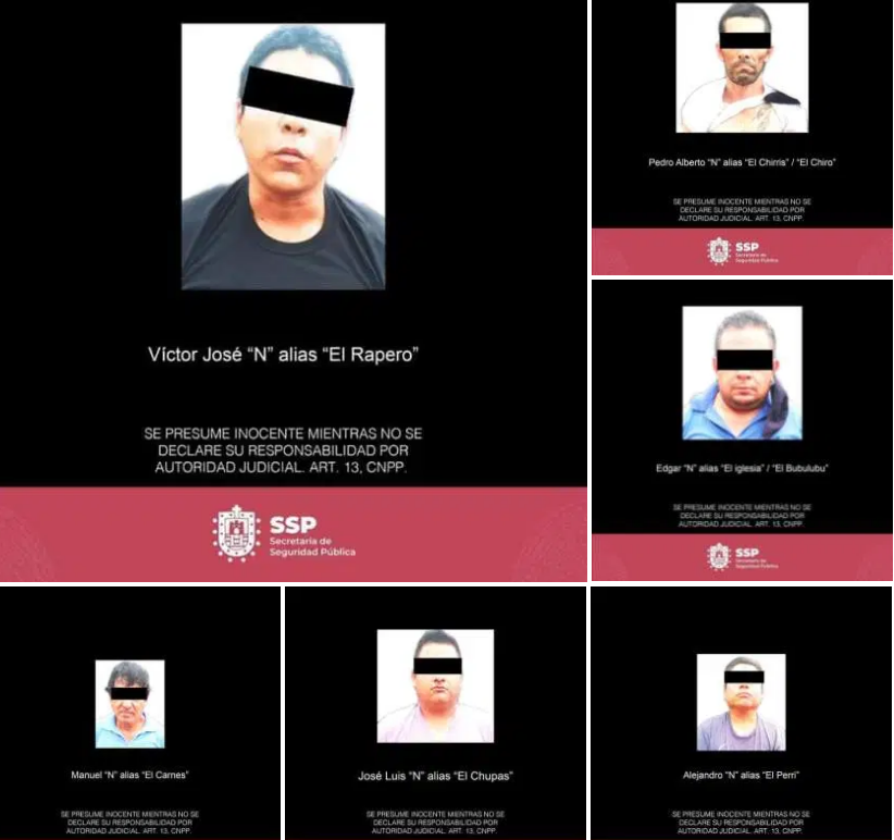 La Secretaría de Seguridad Pública (SSP), a través de elementos de la Policía Estatal, detuvo a Alejandro «N» alias “El Perri”, José Luis «N» alias “El Chupas”, Édgar «N» alias “El Iglesia” o “El Bubulubu”, Víctor José «N» alias “El rapero”, Pedro Alberto «N» alias “El Chirris” o “El Chiro” y a Manuel «N» alias “El Carnes”, supuestos integrantes del Cártel Jalisco Nueva Generación (CJNG), por presuntos delitos contra la salud y portación ilegal de armas de fuego.