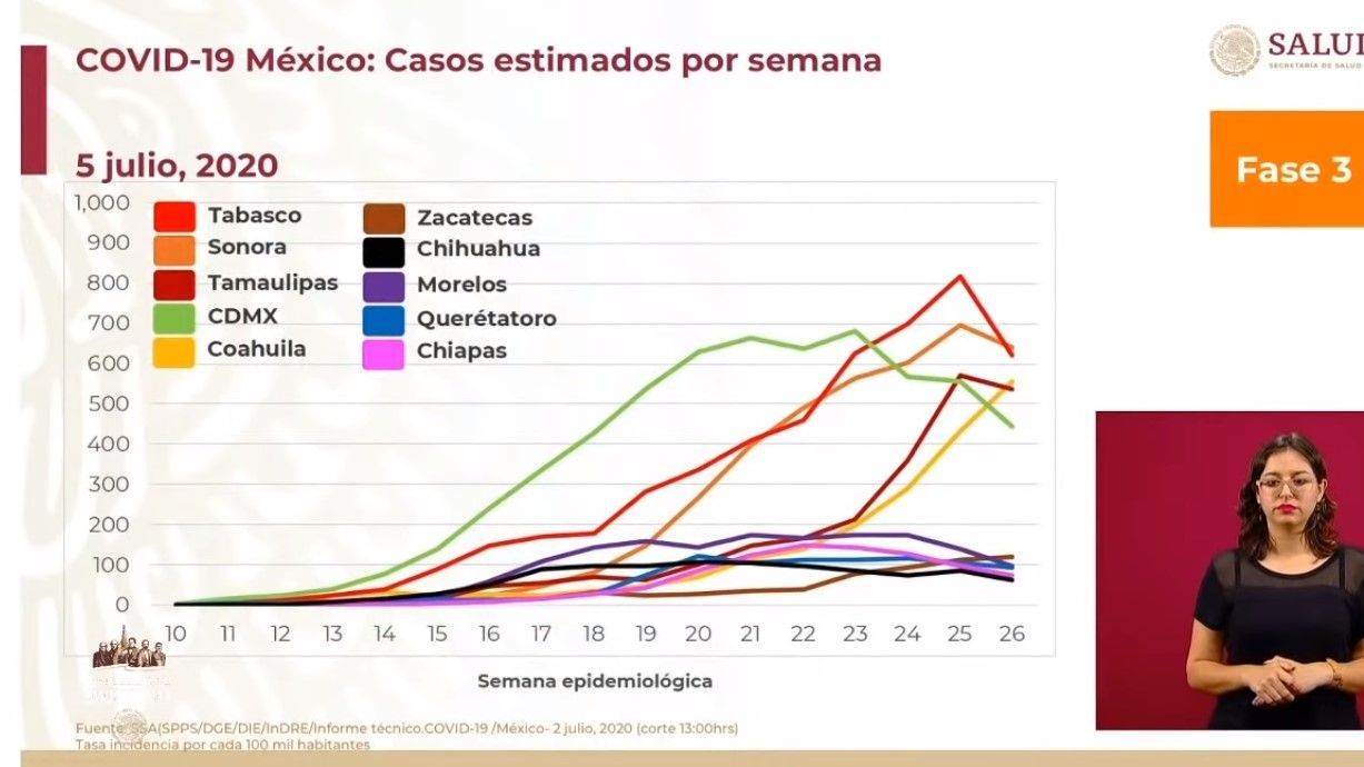 Dicha diapositiva hace referencia a los 5 estados que tienen la curva más baja del país y a su vez los 5 que presentan la curva más ascendente dentro de los 32 estados, siendo Querétaro uno de los 5 con menos casos agregados de Covid-19.
