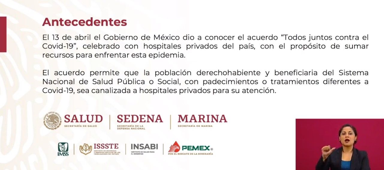 Recordó que el pasado 13 de abril el gobierno de México dio a conocer el acuerdo “Todos Juntos contra el Covid-19” celebrado con hospitales privados del país con el propósito de sumar recursos para enfrentar esta pandemia.