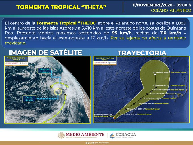 Mientras tanto “Thetha” se ubica sobre el Atlántico norte, aproximadamente a 1,080 km al suroeste de las Islas Azores, y a 5,410 km al este-noreste de las costas de Quintana Roo