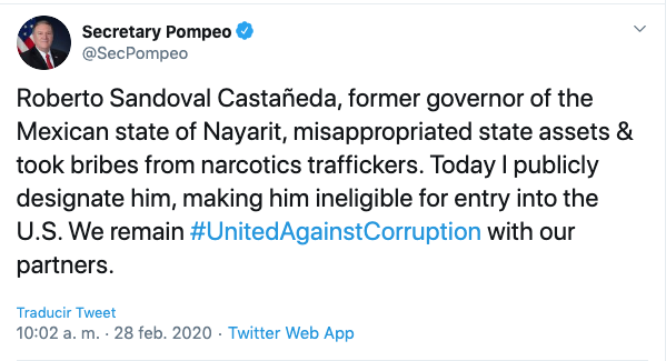 Mike Pompeo, titular del Departamento del Estado norteamericano, señaló a Roberto Sandoval Castañeda, exgobernador de Nayarit, por aceptar sobornos de narcotraficantes en la República Mexicana.