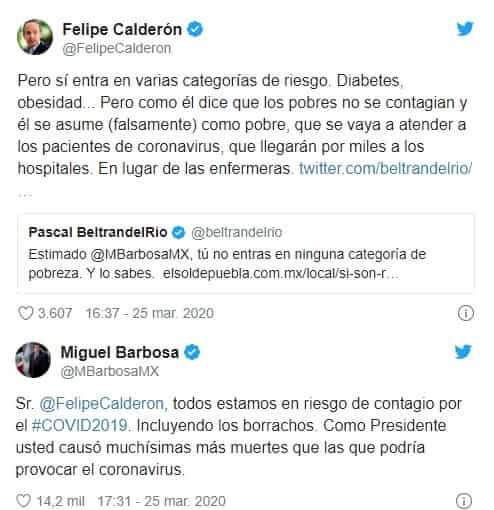 La tarde de este miércoles, el expresidente Felipe Calderón y el gobernador de Puebla, Miguel Barbosa, se enfrentaron en redes sociales por causa del coronavirus Covid-19.
