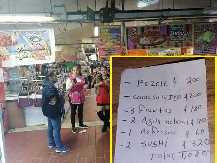 La joven relató que fue en la cocina económica “Comida Lety” donde le quisieron cobrar de más, ya que al momento de hacerle la cuenta final, le cobraron 180 pesos por tres flautas, 400 por un plato de pozole y no de carne en su jugo, 180 por dos botellas de agua y un refresco y 320 por dos rollos de sushi, el cual fue comprado en el local de a lado pero lo agregaron a su cuenta.