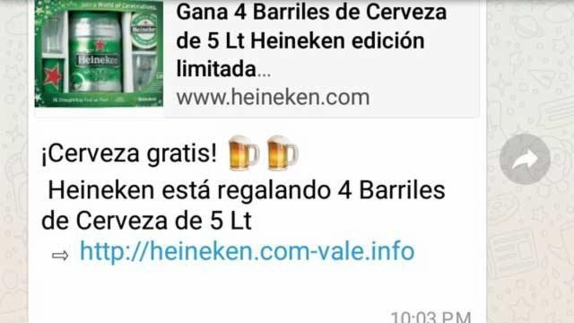 Es falsa la oferta de Heineken donde se brindan cervezas gratis según un mensajes de WhatsaApp, alerta Eset.