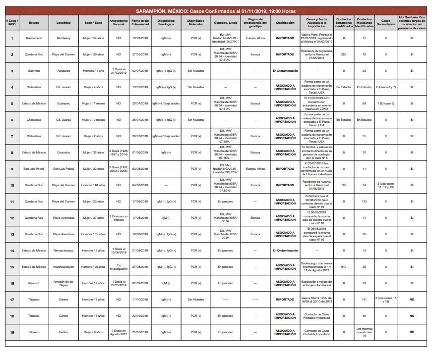 La Secretaria de Salud del gobierno de México informó el pasado 01 de Noviembre sobre 19 casos confirmados de sarampión en el país.