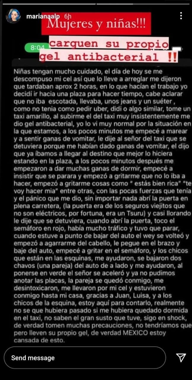 En su narración de los hechos publicada en una historia de Instagram la chica afirma que, tras abordar un taxi amarillo de la ciudad de Tijuana, el conductor le ofreció gel antibacterial, a lo que ella accedió al ser algo normal en estos tiempos.