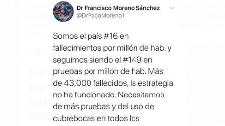 En un tweet, publicó “Somos el país #16 en fallecimientos por millón de hab. y seguimos siendo el #149 en pruebas por millón de hab. Más de 43,000 fallecidos, la estrategia no ha funcionado. Necesitamos de más pruebas y del uso de cubrebocas en todos los espacios. El #COVID2019 no perdona errores”.