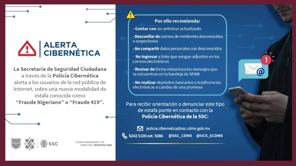 Personal de la Policía Cibernética de la Secretaría de Seguridad Ciudadana (SSC) de la Ciudad de México, informa a los usuarios de la red pública de Internet, sobre una nueva modalidad de estafa conocida como “Fraude Nigeriano” o también como “Fraude 419”.