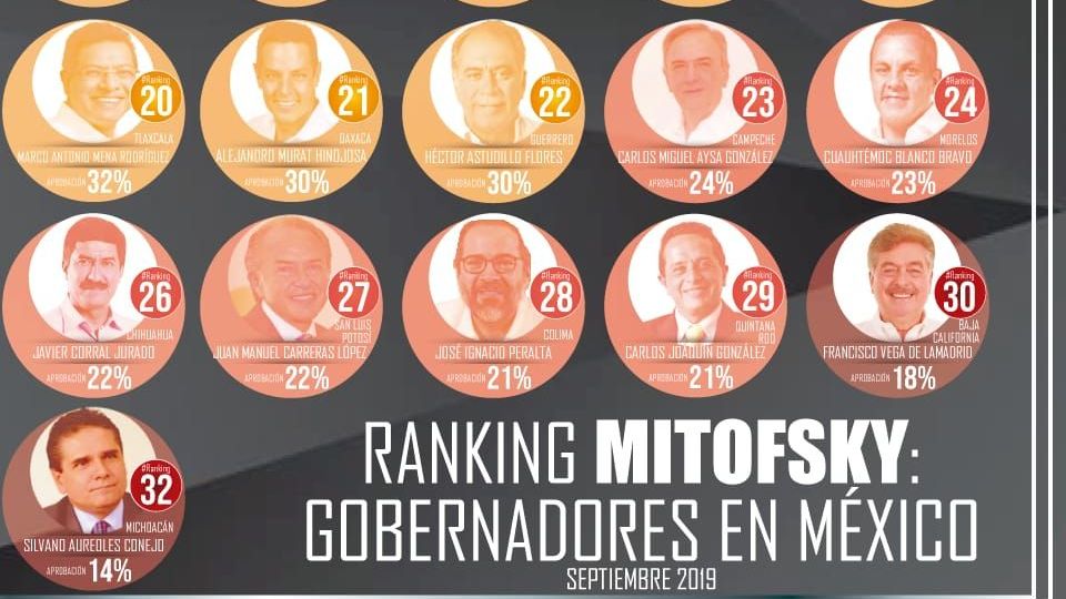 Por otra parte, los mandatarios mejor evaluados son: Mauricio Villa (Yucatán) con 78%, Quirino Ordaz (Sinaloa) con 62% y Rutilio Escandón (Chiapas) con 54%.