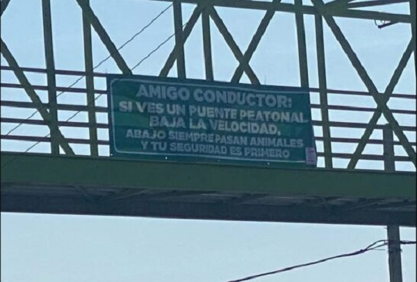 “Amigo conductor: si ves un puente peatonal, baja la velocidad, abajo siempre pasan animales y tu seguridad es primero”, decía la manta.