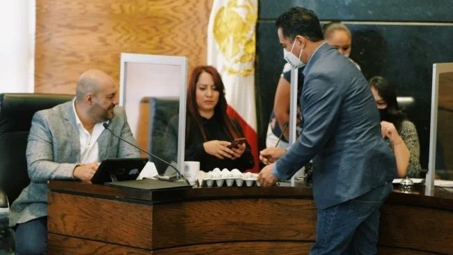 José Antonio Ochoa, diputado panista en Durango, comenzó a repartir huevos durante la sesión de este martes en el Congreso local, con la leyenda “Para que sostengas tu palabra”, a sus homólogos de Morena, pues aseguró que existía un acuerdo para que el PAN encabezara la Junta de Gobierno y Coordinación Política del Congreso en el tercer año.