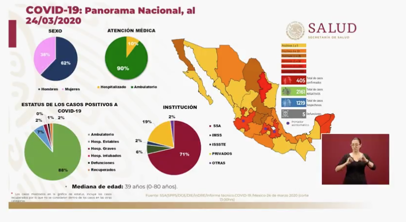 Al día de hoy 24 de marzo, al entrar México a la fase dos, hay 405 casos confirmados de coronavirus Covid-19.