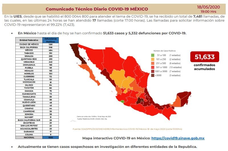 México reportó el lunes 2,414 nuevos casos de coronavirus, con lo que total de personas contagiadas en ese país se elevó a 51,633, en una jornada en la que el gobierno lanzó los protocolos para reiniciar actividades de algunas industrias consideradas esenciales.