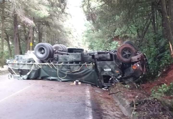 Un vehículo del Ejército Mexicano, que se desplazaba en el tramo carretero de Siltepec-Porvenir, donde viajaban 4 elementos del ejército mexicano y se dirigían a dejar unos libros volcó este martes.
