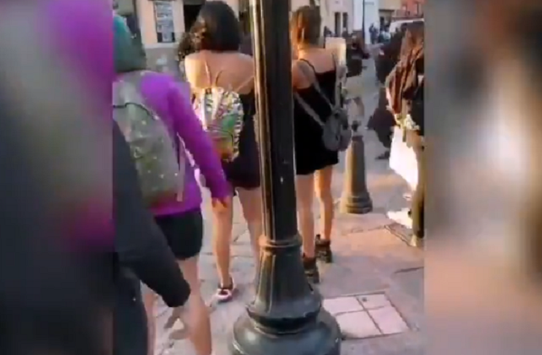 A través de las redes sociales circula un video en el que se observa el momento en que las jóvenes rodean al hombre a quien golpean y corren del Jardín de la Corregidora, lugar donde se realizaba la protesta.