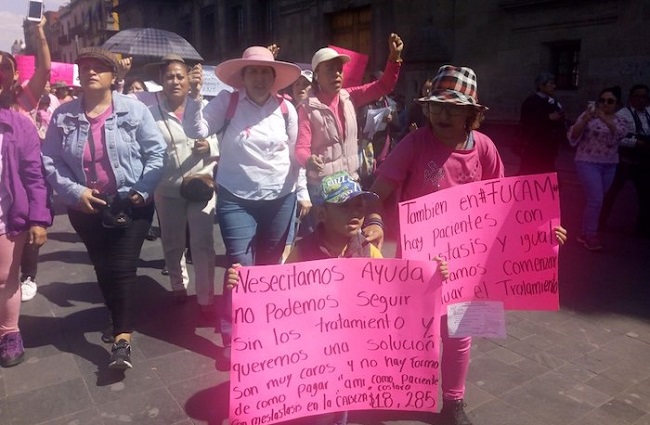 En las cartulinas de mujeres de la tercera edad y otras más jóvenes se leen exigencias como “un Gobierno democrático no mata a los enfermos de cáncer”. Las mujeres esperan a que inicie la reunión que cinco de sus representantes tendrán con funcionarios de la Secretaría de Salud y que acordaron ayer luego de que protestarán y cerrarán por una hora el tramo de Calzada de Tlalpan cercano a la Fucam. Las manifestantes juntarán firmas para entregarlas en la reunión.