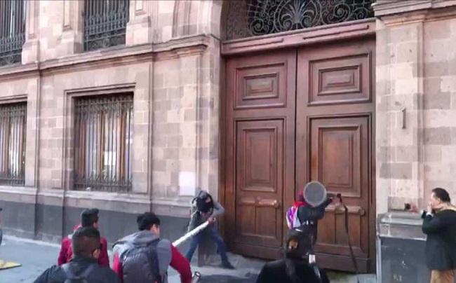 Esta mañana, una de las puertas de madera de Palacio Nacional ubicada en la calle de Moneda fue dañada por estudiantes de la Normal Rural “Raúl Isidro Burgos” de Ayotzinapa, Guerrero, luego de que estudiantes trataran de ingresar al recinto, lo que fue impedido por personal que resguarda el inmueble.