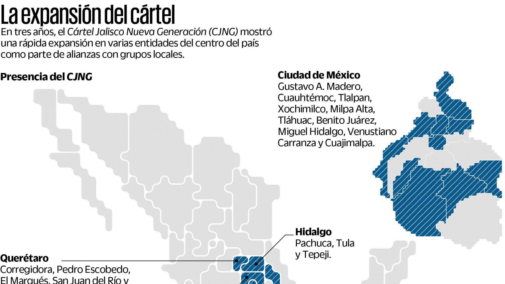 En tres años, el Cártel Jalisco Nueva Generación (CJNG) penetró seis estados del centro del país con células operativas o alianzas con grupos locales, llegando así a Morelos, Estado de México, Ciudad de México y posteriormente a Puebla, Hidalgo y Querétaro.