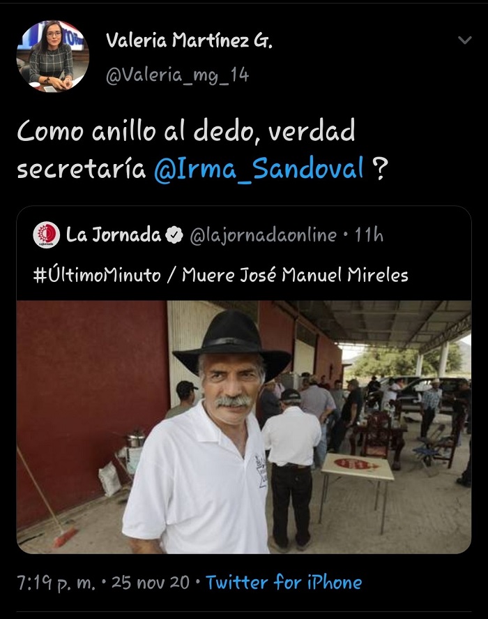 Ejemplo de ello es Valeria Martínez, colaboradora de Foro TV que aseguró que la muerte de Mireles cae “como anillo al dedo” a la secretaria Irma Eréndira Sandoval.