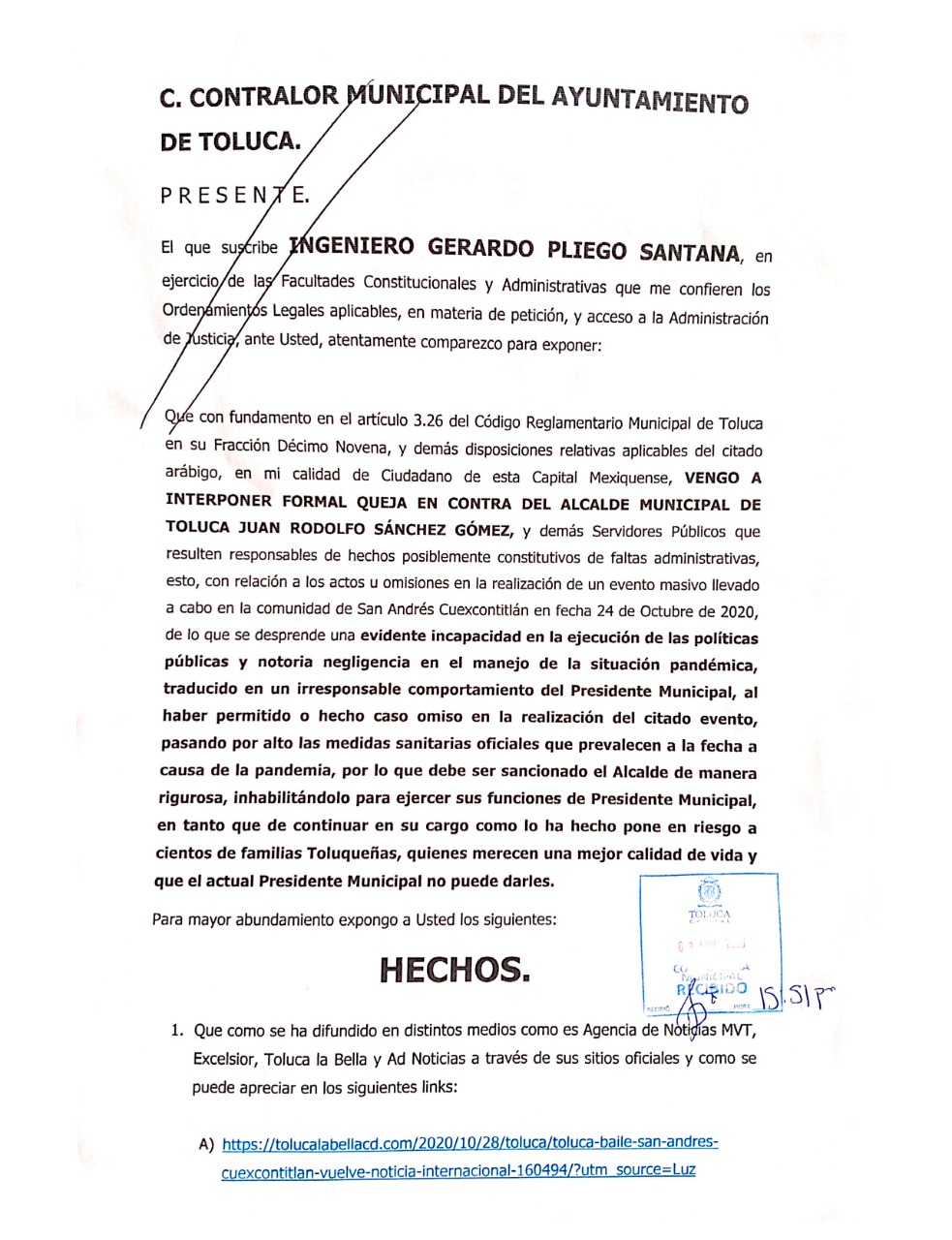 Tras el baile que hubo el pasado 24 de octubre el exdiputado Gerardo Pliego notificó que interpuso una denuncia contra el presidente municipal Rodolfo Sánchez y a los servidores públicos que resulten responsables de aceptar la realización del baile “Agarrón 100% Carnavalero”.