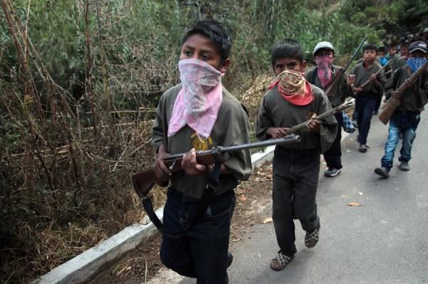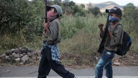 Los menores, de entre 8 y 14 años, fueron presentados por la Coordinadora Regional de Autoridades Comunitarias-Pueblos Fundadores (CRAC-PF) en una especie de práctica militar, en plena carretera, en la que presentaron sus armas.