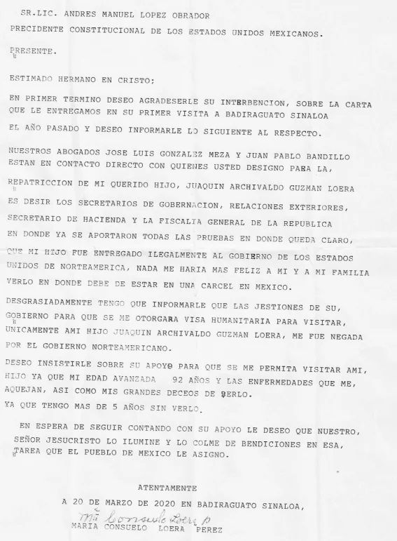 Consuelo Loera Pérez, madre del capo Joaquín “El Chapo” Guzmán, solicitó al Presidente Andrés Manuel López Obrador su intervención para que su hijo sea repatriado a nuestro país, porque en su opinión su proceso de extradición a Estados Unidos fue ilegal.