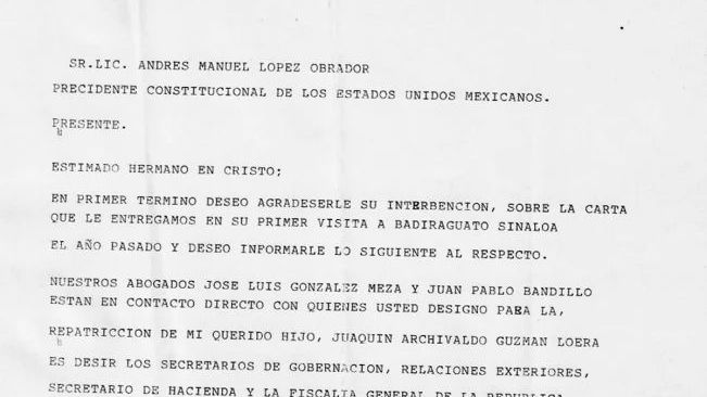 Por medio de una carta, que difundió Presidencia de la República, la señora Consuelo Loera le explicó al presidente de México que sus abogados han entregado todas las pruebas a los secretarios de Gobernación, Relaciones Exteriores, Hacienda y Fiscalía General de la República “en donde se demuestra” que su hijo fue entregado ilegalmente al gobierno de Estados Unidos.