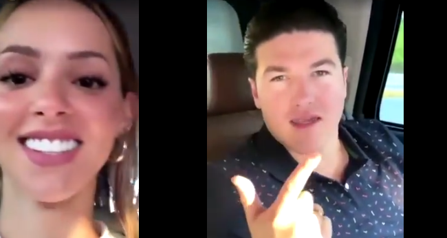 Su esposa, en lugar de responderle, se desentiende de la conversación y enfoca el rostro, mientras pregunta por los tenis que trae: “¿quieren ver mis tenis?”, y luego baja la cámara y muestra el calzado de color anaranjado fosforescente.