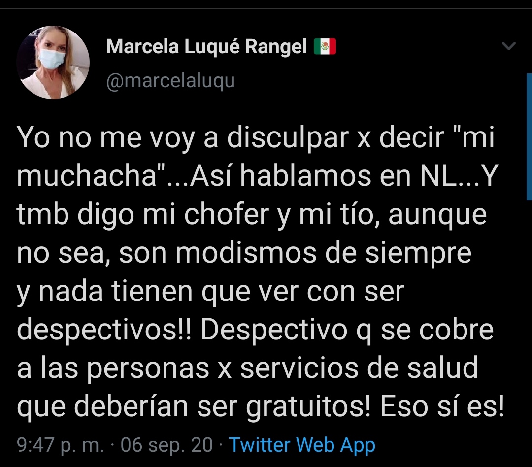 La tarde del pasado domingo, Marcela Luqué, senadora suplente de movimiento ciudadano, fue denunciada en redes por lanzar una serie de comentarios despectivos en contra de las trabajadoras del hogar, los militantes de morena y en general contra la población.