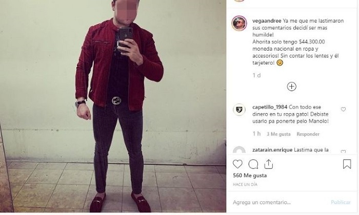 «Ya que me lastimaron sus comentarios decidí ser más humilde! Ahorita solo tengo $44,300.00 moneda nacional en ropa y accesorios! Sin contar los lentes y él tarjetero! (sic)», escribió.