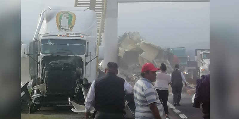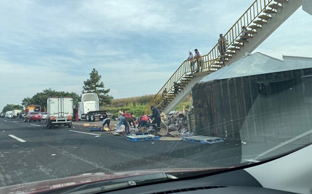 Aparatoso accidente beneficia a habitantes y transportistas que circulaban por el lugar, luego de que un trailer sufriera una fuerte volcadura sobre la autopista México-Puebla, quedando esparcidos sobre toda la carretera productos diversos de consumo.