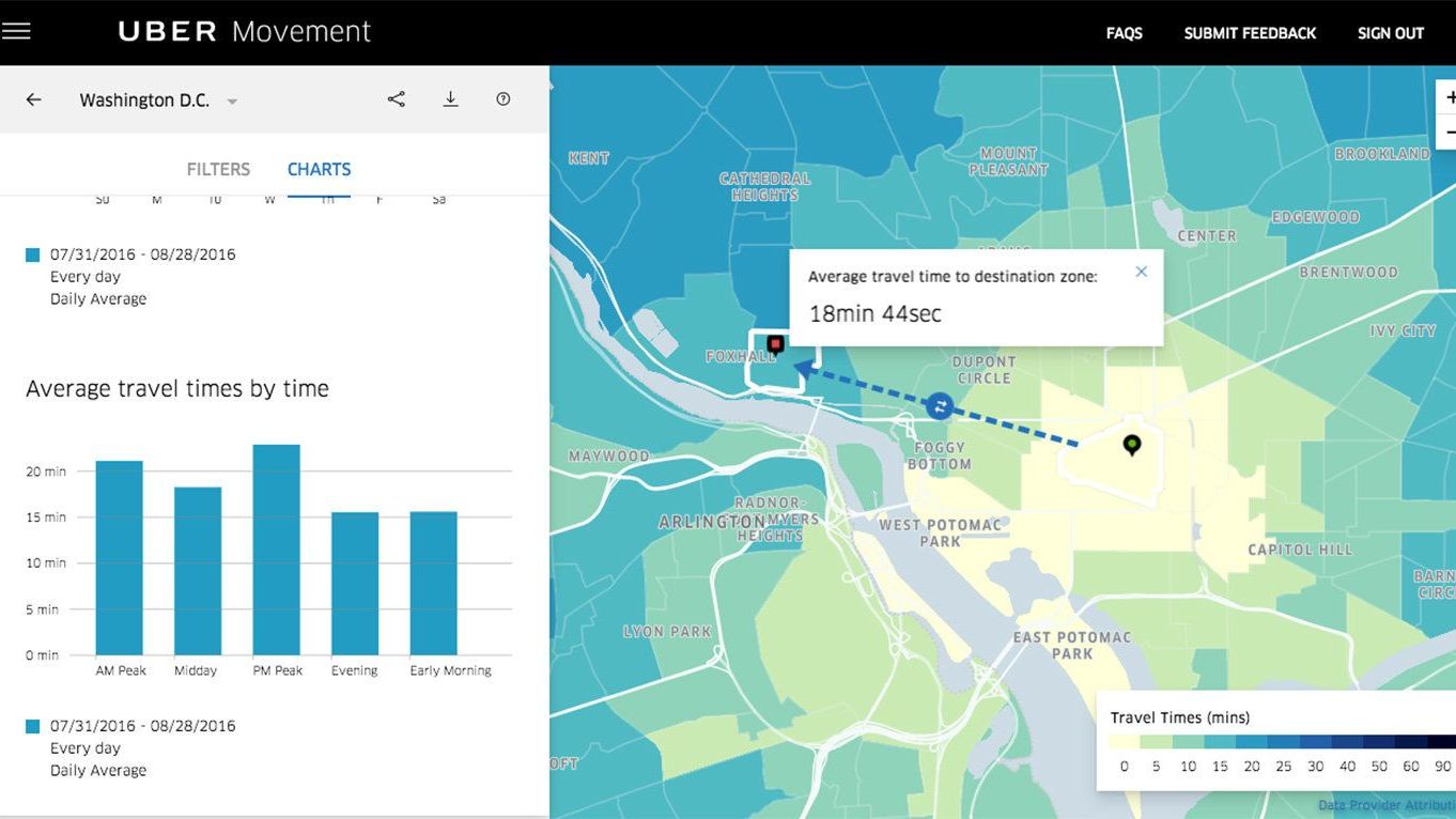 Uber presentó la plataforma Uber Movement, un sitio web público y gratuito donde cualquier persona, académico, gobierno o investigador, puede acceder a la base de datos de los viajes realizados por los usuarios de la plataforma desde el 1 de enero de 2016.