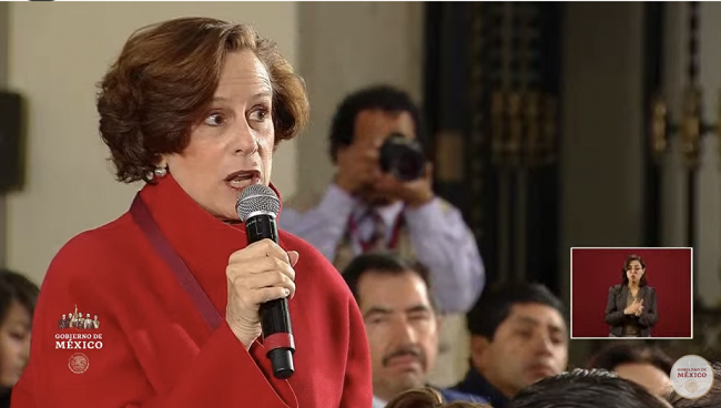 La mañanera comenzó con una exposición de la situación de Petróleos Mexicanos (Pemex). Dresser estaba sentada en la segunda fila, justo en medio. Iba vestida con un abrigo rojo que resaltaba.