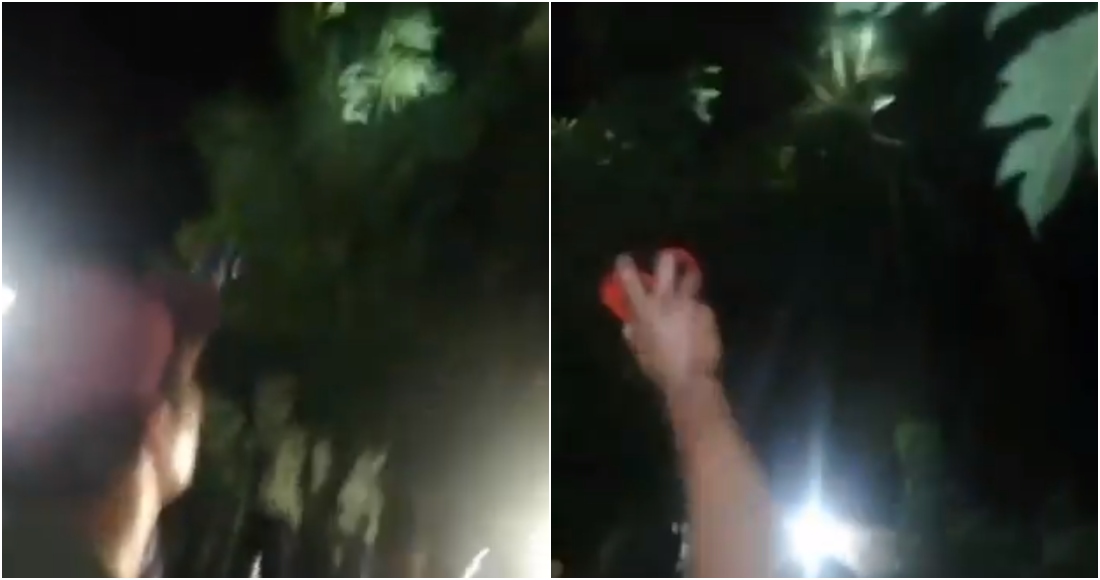 Un video que circula en redes sociales muestra cómo una multitud sale de sus domicilios entre la oscuridad de la noche, con lámparas intentando dar con el ser mitad animal-mitad humano, que aparentemente se había escondido entre las palmeras.