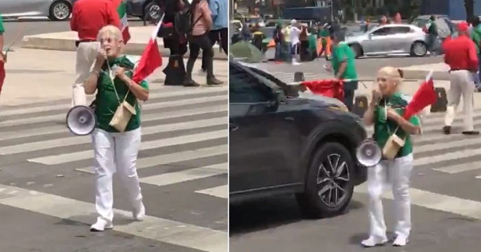 Un video que se ha hecho viral en redes sociales muestra a una mujer ataviada con una playera verde y pantalón blanco exhortar a los automovilistas detenidos en el semáforo a ocupar las tiendas.
