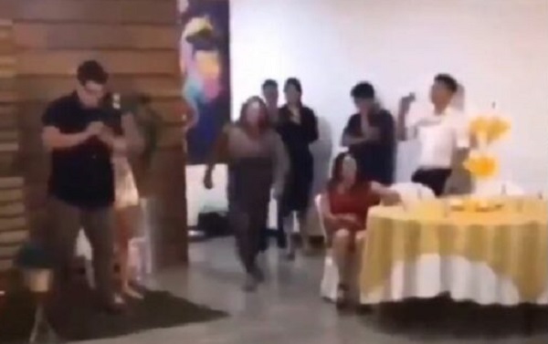 En redes sociales se difundió un video que muestra el momento en el que la mujer llega al lugar gritando, mientras algunos de los invitados intentan detenerla.