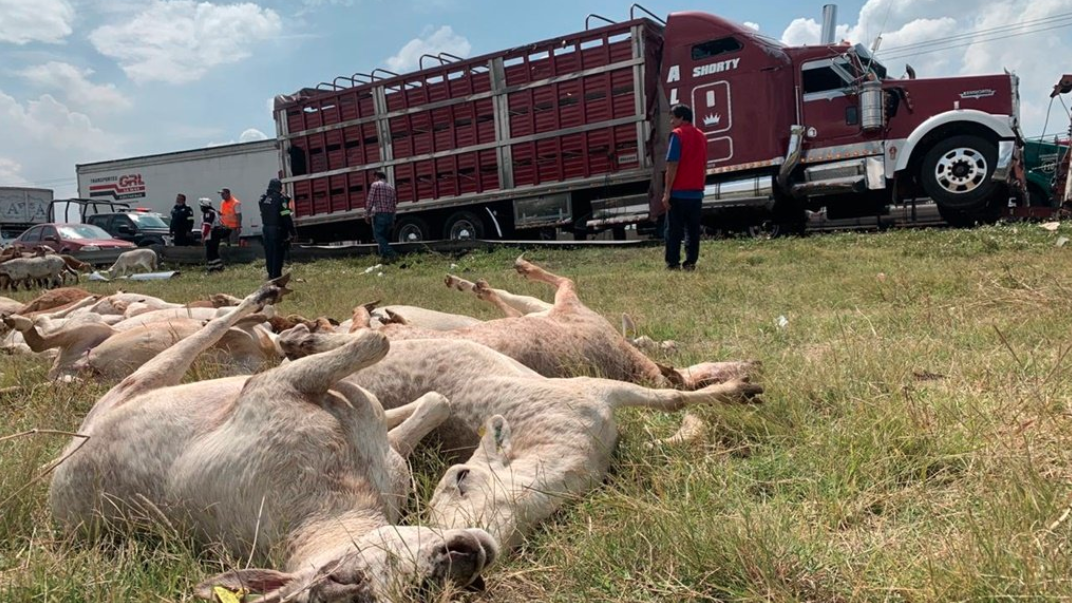 El percance ocurrió poco antes de las 14:00 horas de este lunes, cuando el vehículo que transportaba a los animales circulaba por esa vialidad y a la altura del kilómetro 29+300, un tráiler intentó rebasar una camioneta que viajaba por esa misma vía.