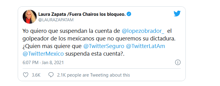 “Quiero que suspendan la cuenta de AMLO, el golpeador de los mexicanos, no queremos su dictadura. ¿Quién más quiere que Twitter suspenda esta cuenta?”, tuiteó.