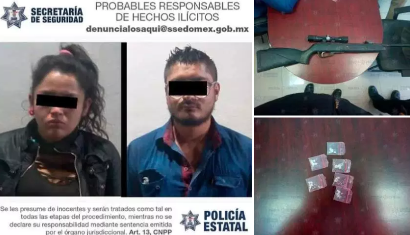 Ante la actitud sospechosa del conductor y su acompañante, los policías mexiquenses les solicitaron realizar una revisión preventiva que derivó en el hallazgo de un rifle de diábolos con cañón metálico y mira telescópica.