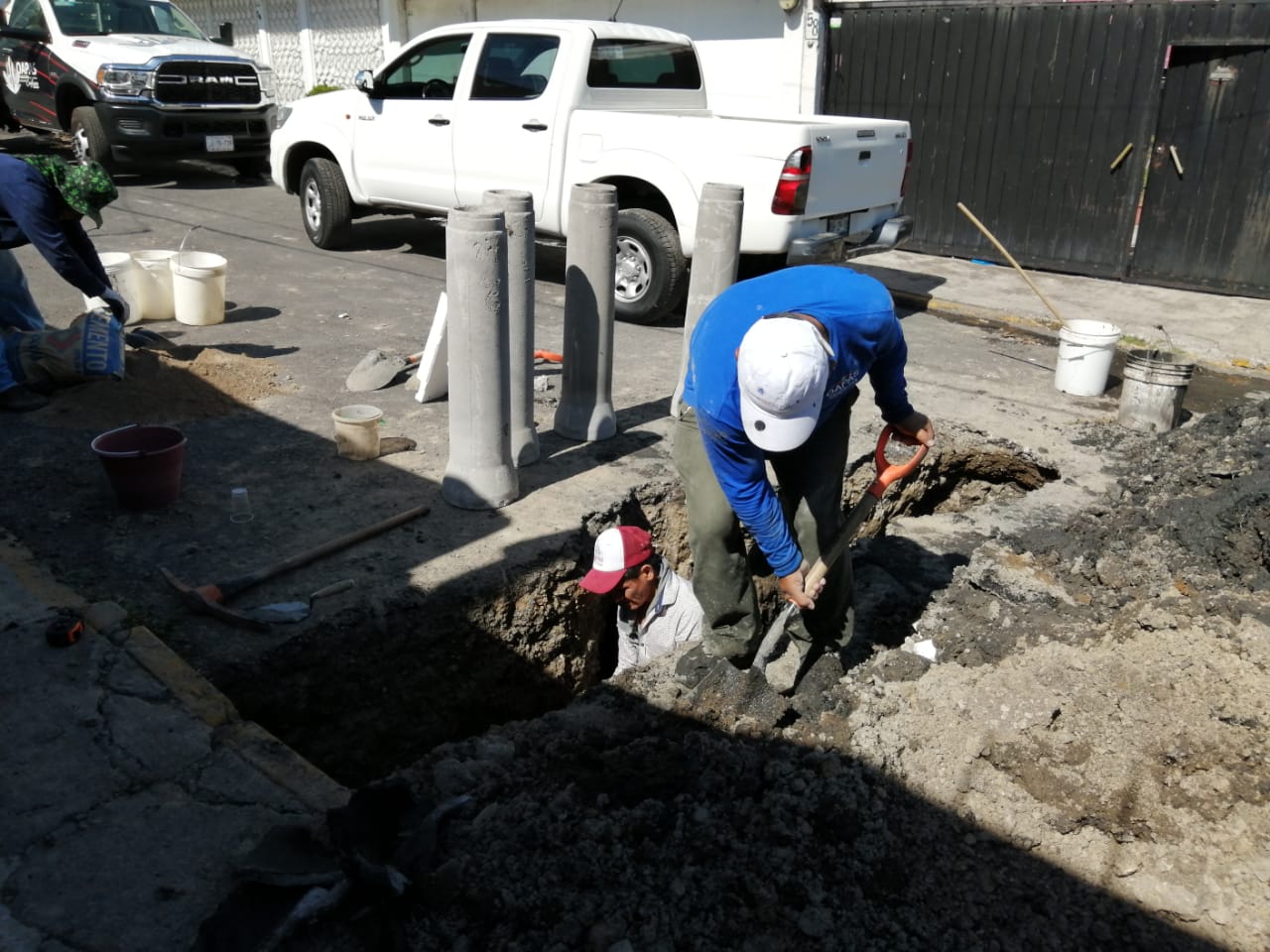El grupo de trabajadores efectuó la reparación de un hundimiento en calles del fraccionamiento Bosques de Los Remedios, el cual se originó por el colapso de una descarga domiciliaria a la red sanitaria.