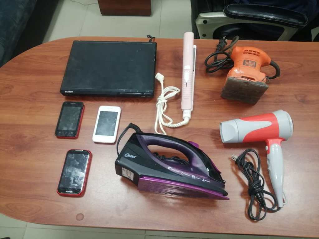 En la bolsa de plástico encontrada a unos metros del delincuente se encontraban una plancha de ropa marca Oster,Una secadora de pelo marca Taurus, Una lijadora Black and Decker, un DVD marca Sony, una plancha de cabello marca Conair, Dos celulares Alcatel marca OneTouch, así como un celular Motorola Ferrari.