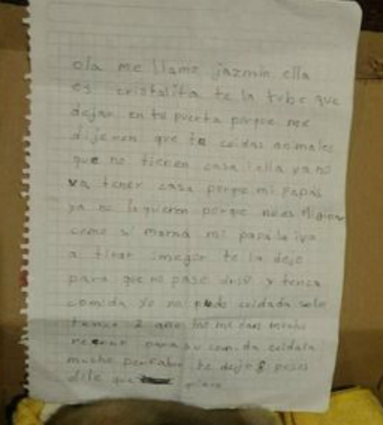 “Hola me llamo Jazmín y ella es Cristalita, te la tuve que dejar en tu puerta porque mis papás no la quieren porque no es original. Mi mamá y mi papá la quieren tirar, mejor te la dejo para que no pase frío y tenga comida”, escribió la niña.