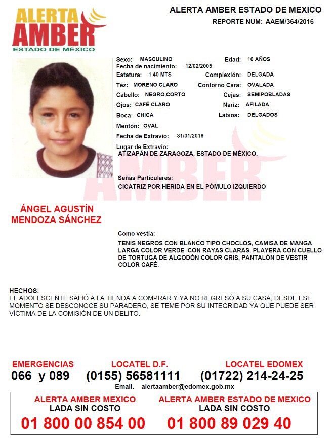 Autoridades del Estado de México activaron la Alerta Amber luego de que el pasado 21 de enero se reportara la desaparición de Ángel Agustín Mendoza Sánchez, de 10 años de edad, en el municipio de Atizapán de Zaragoza, Estado de México.