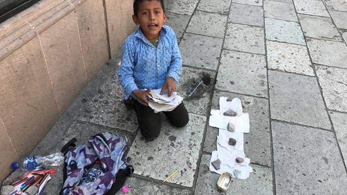 Oaxaca.- Alex de nueve años, llegó de Guerrero con su familia. Su madre es vendedora ambulante de artesanías en el Zócalo junto a su hermana y su padre.