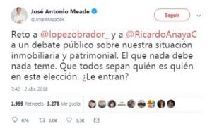 “Reto a López Obrador y a Ricardo Anaya a un debate público sobre nuestra situación inmobiliaria y patrimonial. El que nada debe nada teme. Que todos sepan quién es quién en esta elección. ¿Le entran?”, escribió.