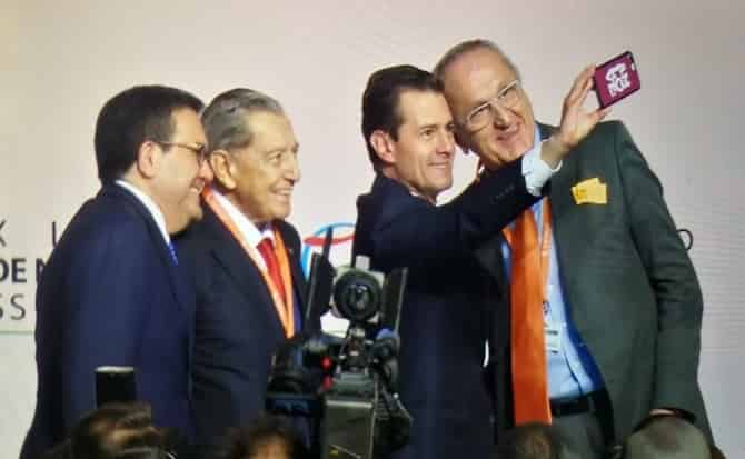 El presidente Enrique Peña Nieto participó este lunes en la Cumbre de Negocios 2018, en donde se tomó una selfi con el empresario Miguel Alemán, el secretario de Economía, Ildefonso Guajardo, y el negociador de López Obrador en el T-MEC, Jesús Seade.