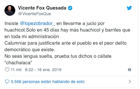 “Calumniar para justificarte ante el pueblo es el peor delito democrático que existe. No seas lengua suelta, prueba tus dichos o cállate chachalaca”, escribió Fox en Twitter.
