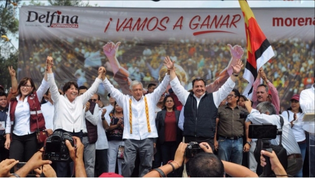 En la imagen aparece la candidata de Morena, junto con dos personas ataviadas como Carlos Salinas de Gortari y el actual presidente Enrique Peña Nieto.